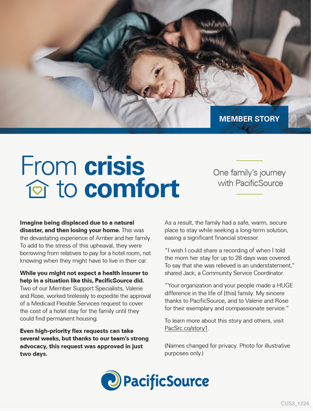 December 2024 From Crisis to Comfort Flier that was part of a multi-channel campaign to share real-life member stories, highlighting PacificSource's customer service.